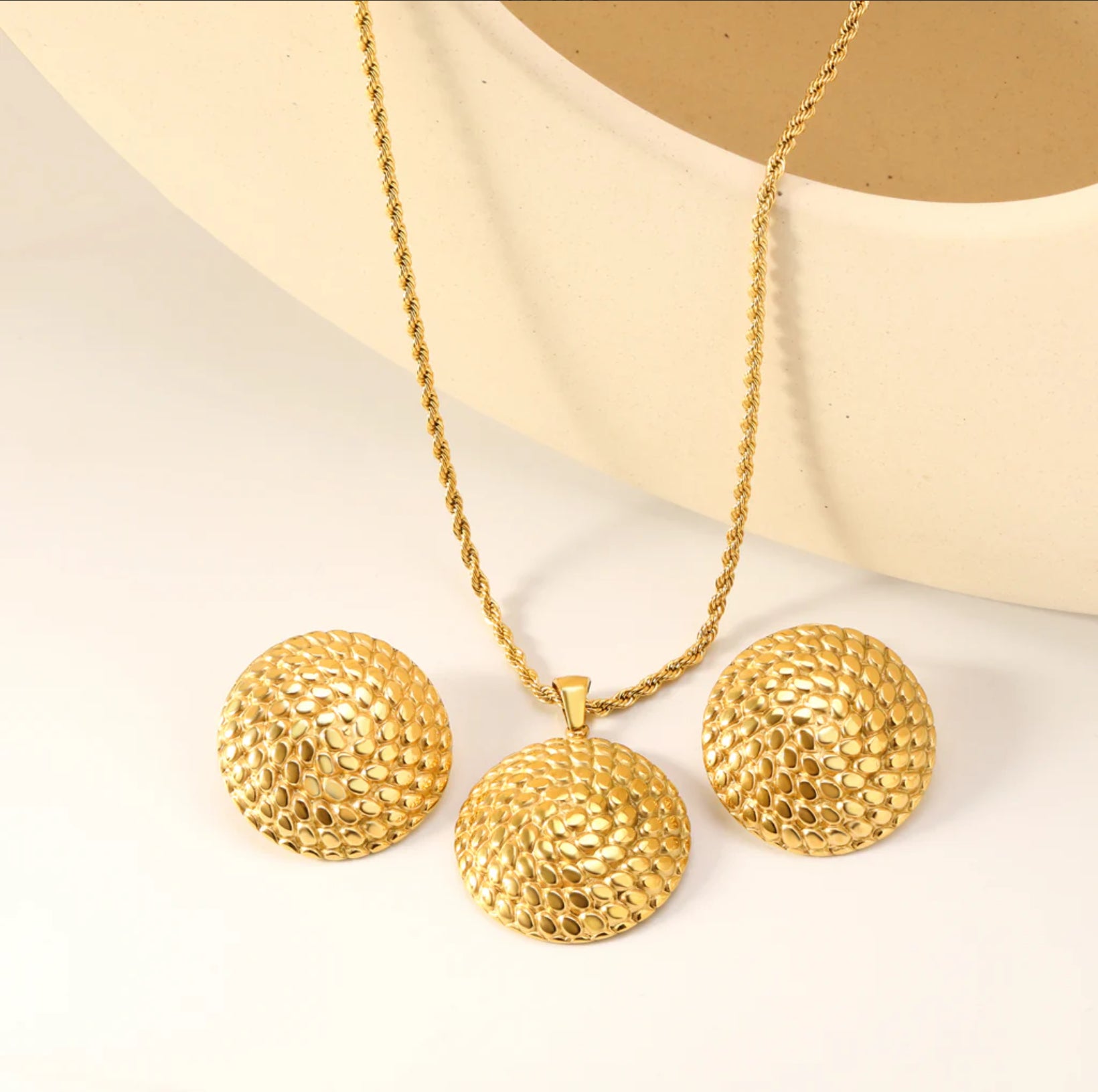 Inspired by the gentle ripples of water and the warmth of golden light, the Ripple Glow Set features textured round pendants that catch and reflect light with every movement. This gold-plated set radiates understated elegance, bringing depth and dimension to a classic silhouette.