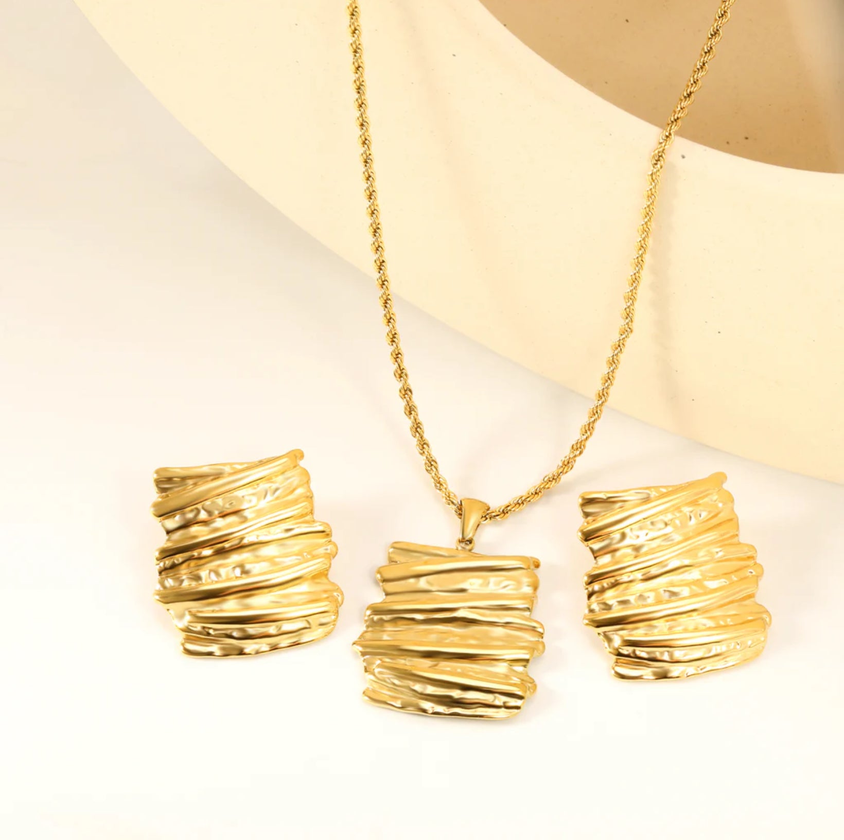 Inspired by raw beauty of desert landscapes, the SAHARA LAYERS JEWELRY SET features a statement necklaces and matching earrings with stacked, uneven gold layers that evoke natural rock formations and sun-sculpted dunes. Each piece is PVD gold finished with a texture that adds depth and character, making this set a true standout.