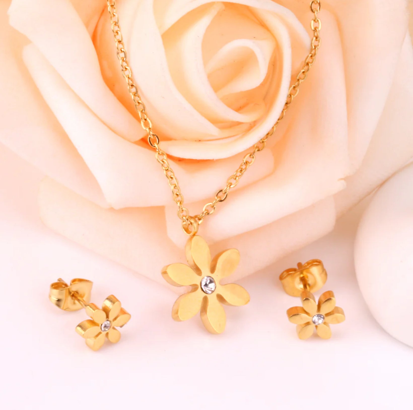 Delicate yet luxurious, the Daisy luxe Jewelry set features a gold-toned daisy pendant and matching earrings, each adorned with a sparkling cubic zirconia at the center. Inspired by timeless floral elegance, this set is perfect for adding a graceful touch to any outfit. Lightweight and radiant, it's ideal for both everyday wear and special occasions.